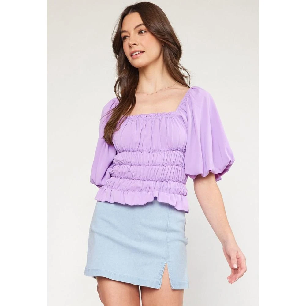 Women’s solid lavender square neck short sleeve top featuring an ruffle trim by Entro.
