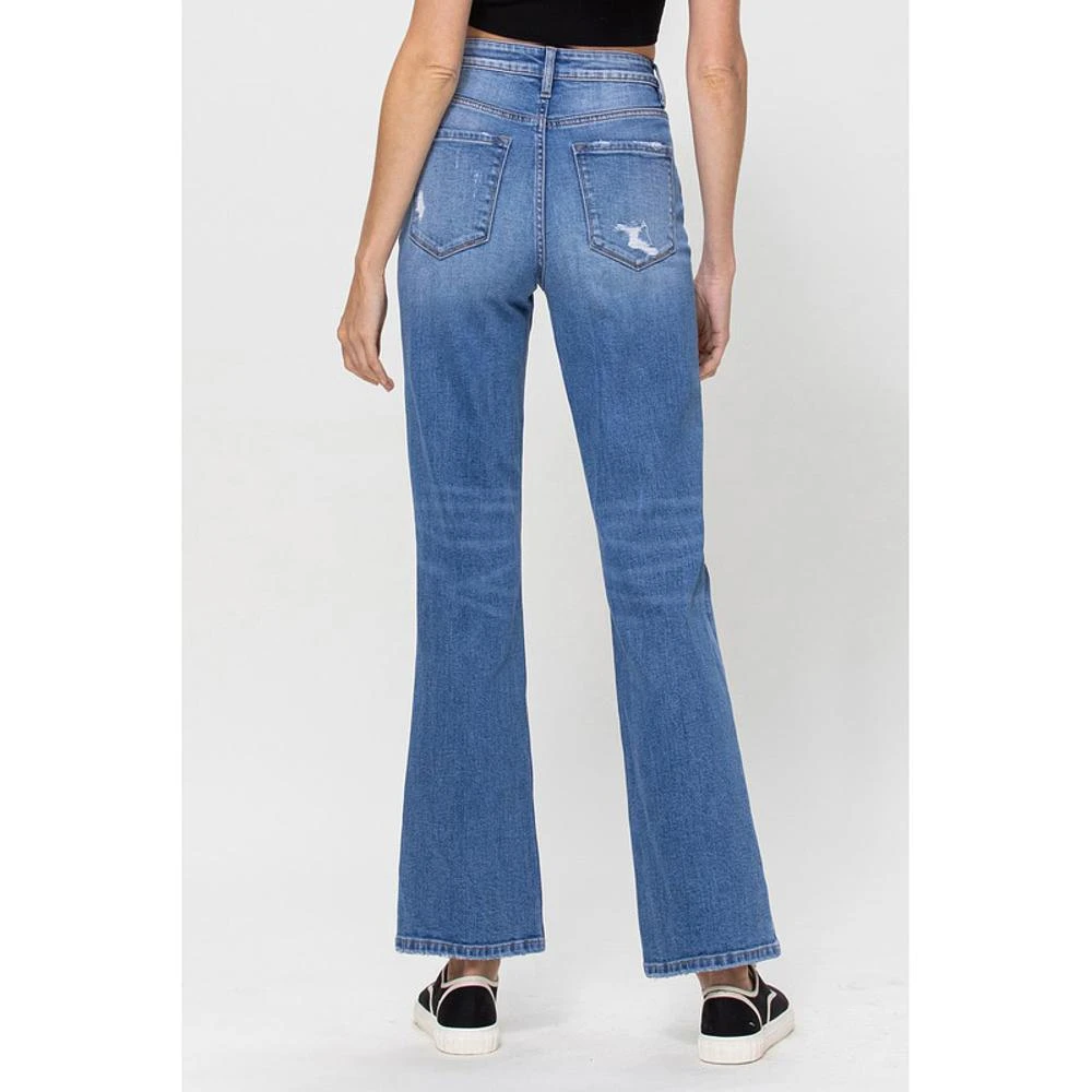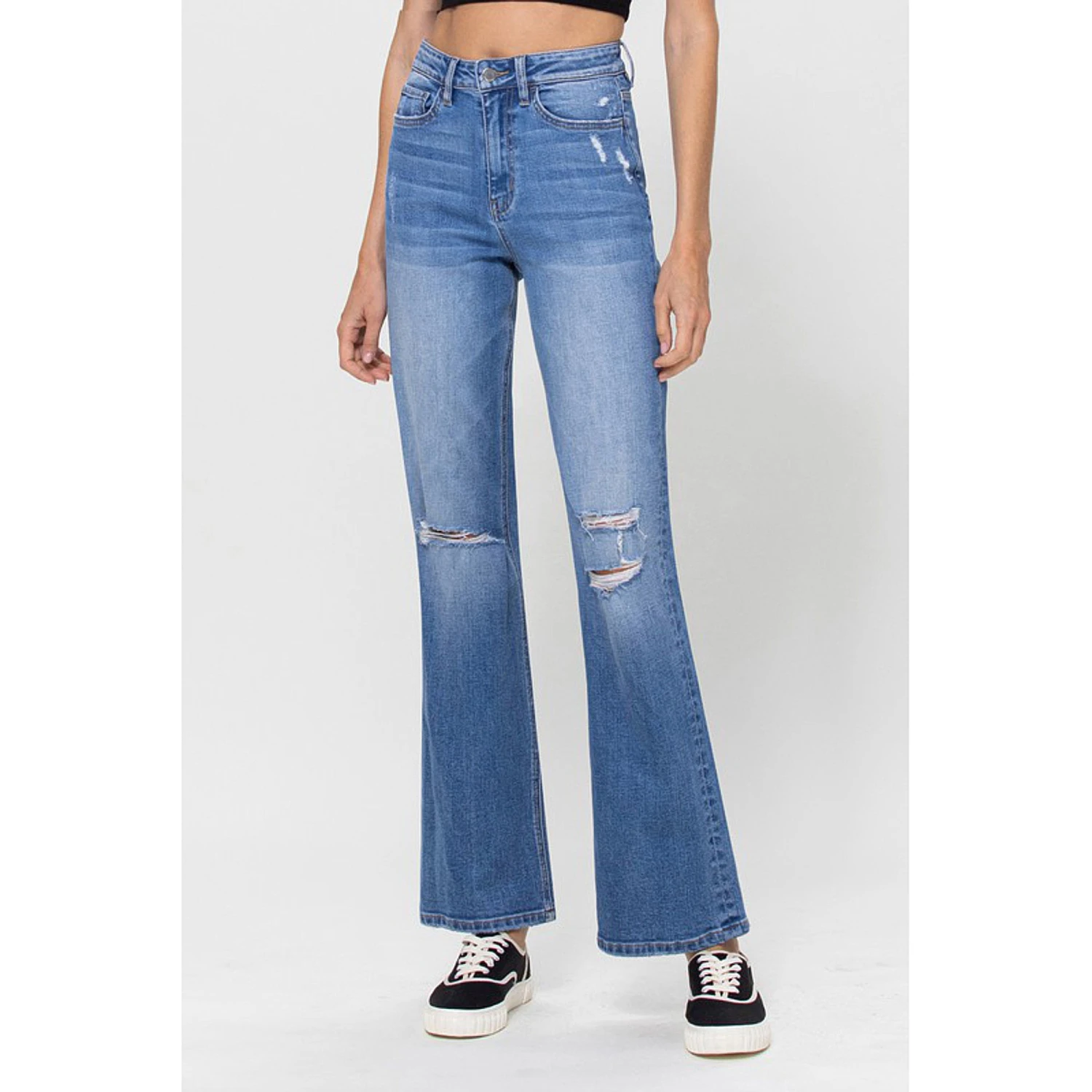 Kind of Blue jeans are a comfortable stretchy denim with a high waist and distressed knee. These will give you that throw back look with comfort.