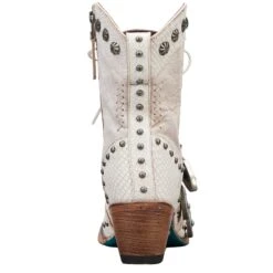 Step out boldly in variegated exotic leather, old pawn inspired hardware, and a functional corset on this ankle boot baddie. An elevated heel to accentuate your best features and bring confidence to your step.