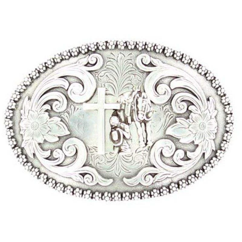 This belt buckle by M&F Western Productsis made to make you look sharp! This is a very nice belt buckle thatfits most size belts and has your traditional belt loop fastener that iseasy to slide on and off. This buckle is made to shine up your outfit!Put this on your favorite leather belt and you will be ready to makeyour best impression. This M&F buckle is made with silver and iswith detailed engraving that makes this buckle unique.