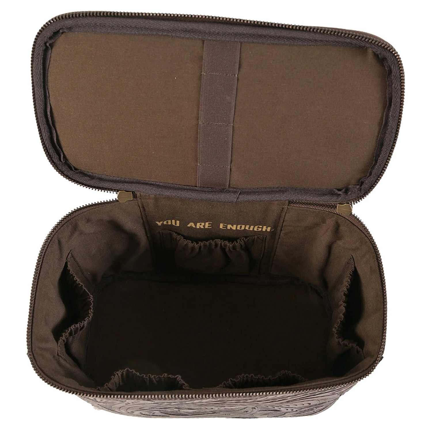 The Westward Train Case is crafted in genuine full grain leather with tooled leather accents that only gets more beautiful with use.