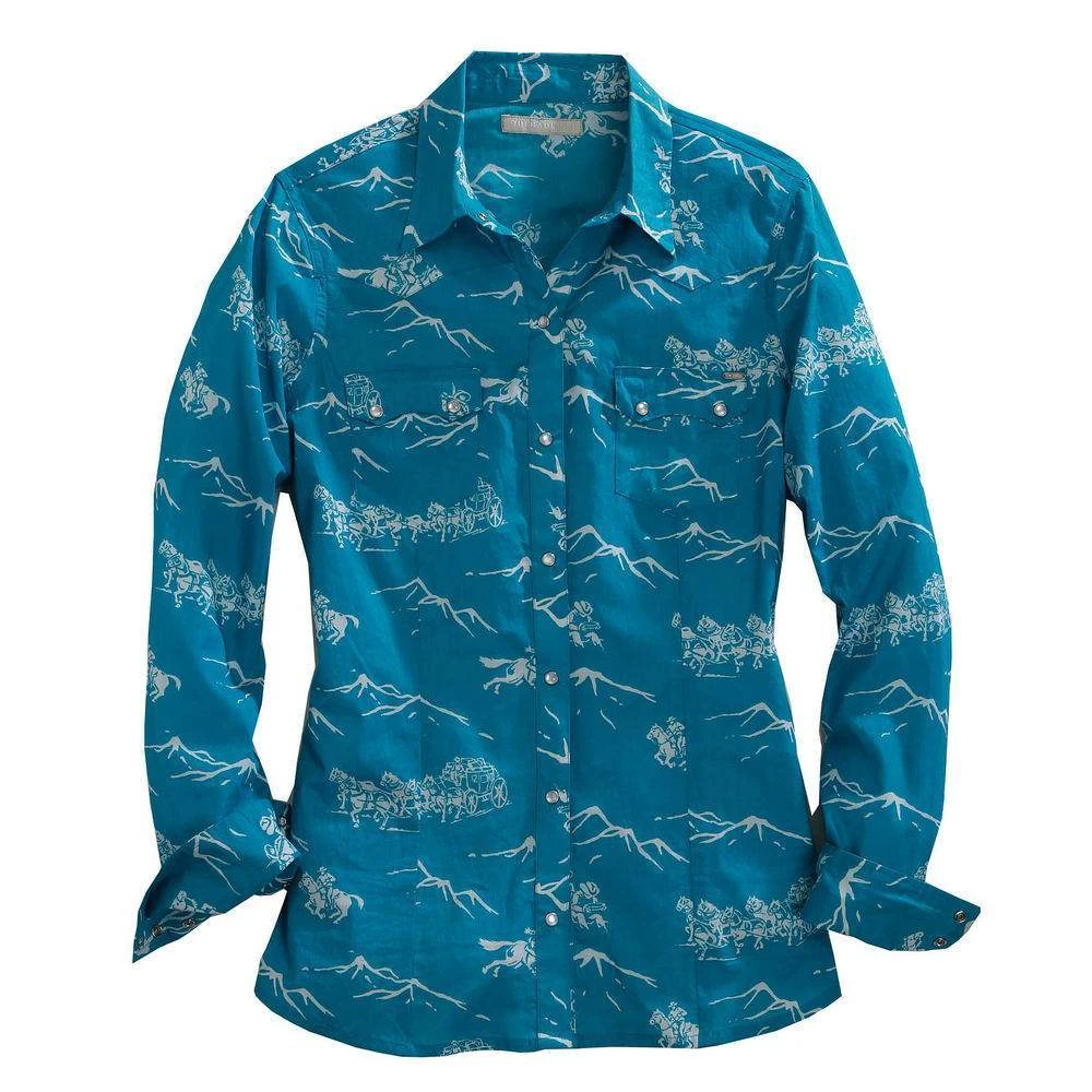 This Tin Haul Gal’s long sleeve shirt features 1 point curved yokes, 2 point pocket flaps, waist darts, 3 snap cuff, pearl snaps and an all-over retro frontier print.