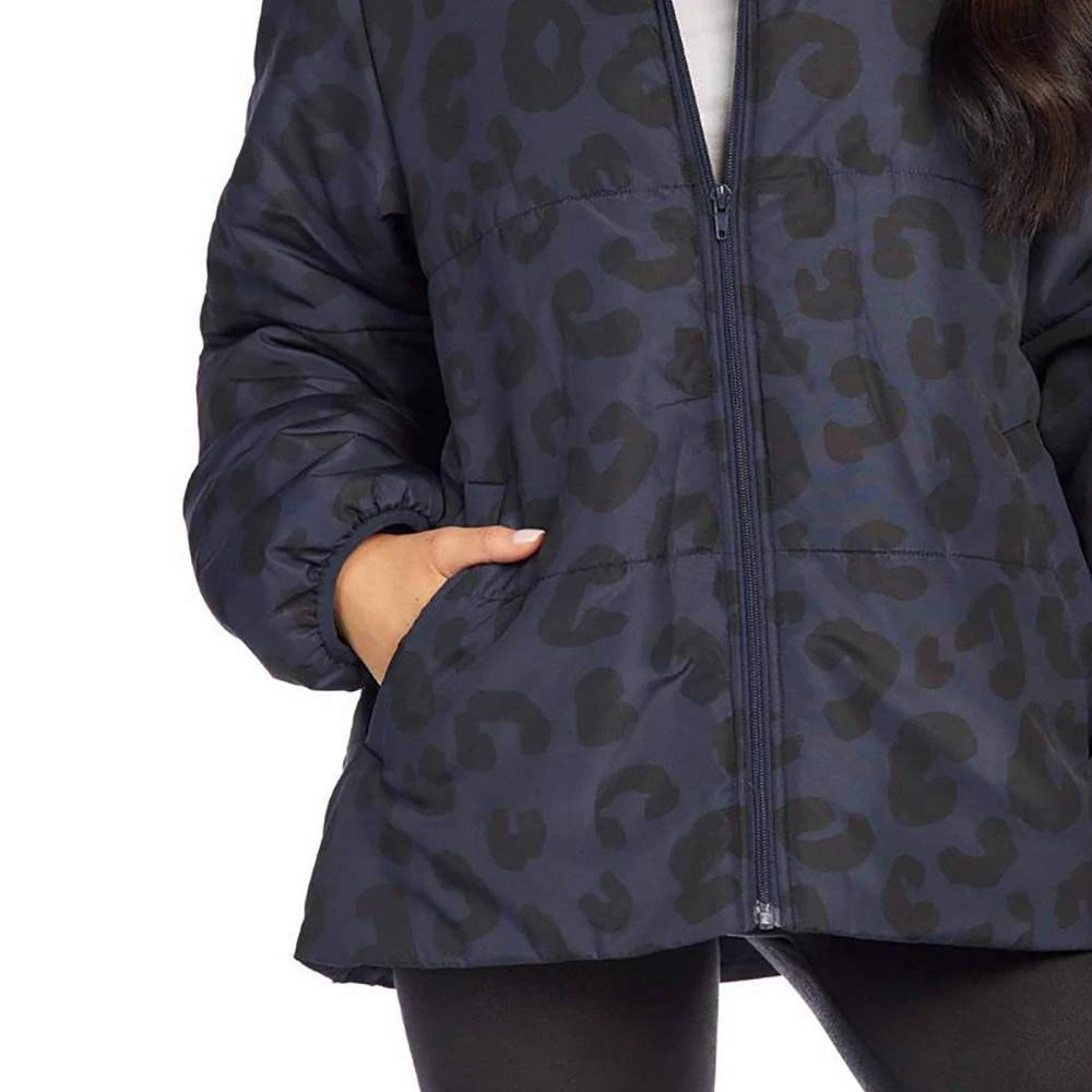 Lined printed puffer jacket with standing collar features front zipper closure and side pockets