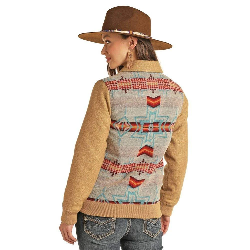 Be warm and trendy in this Women’s Powder River Aztec Wool Bomber Coat.